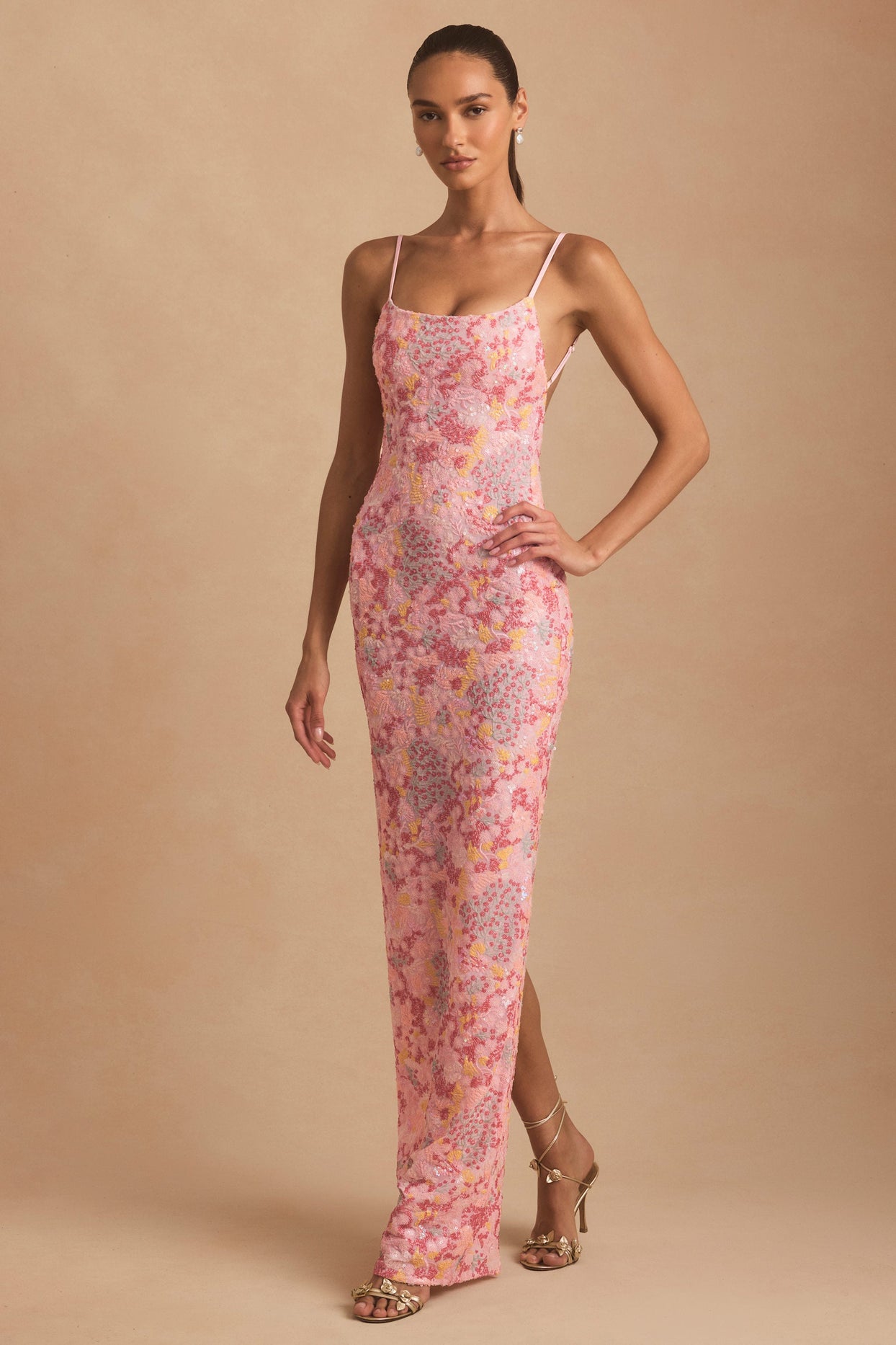 • فستان ماكسي مزين بفتحة رقبة دائرية وظهر مكشوف باللون الوردي