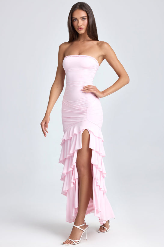 Ethereal silhouettes for social season. The perfect complement to special events, the Hayami maxi dress is cut to a bodycon silhouette with a ruffled column skirt. It’s crafted from lightweight sheer jersey with a full lining and features perfectly placed ruching at the bodice for a figure-flattering finish. The bandeau neckline is traced with unique appliqué detailing, echoing the collection’s attention to detail.