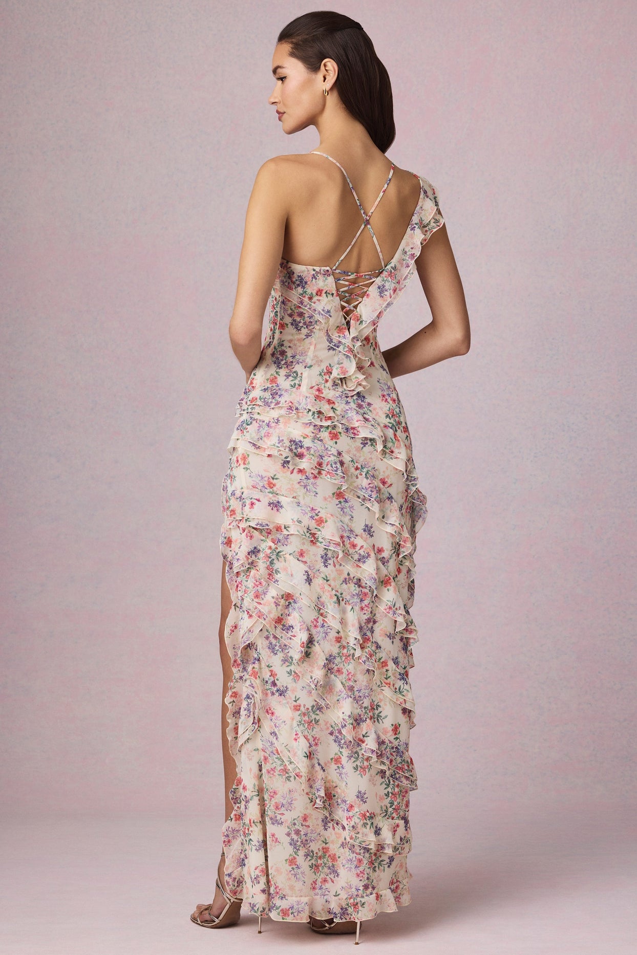 Asymmetric Ruffled Lace-Up Gown in Primrose Floral Print