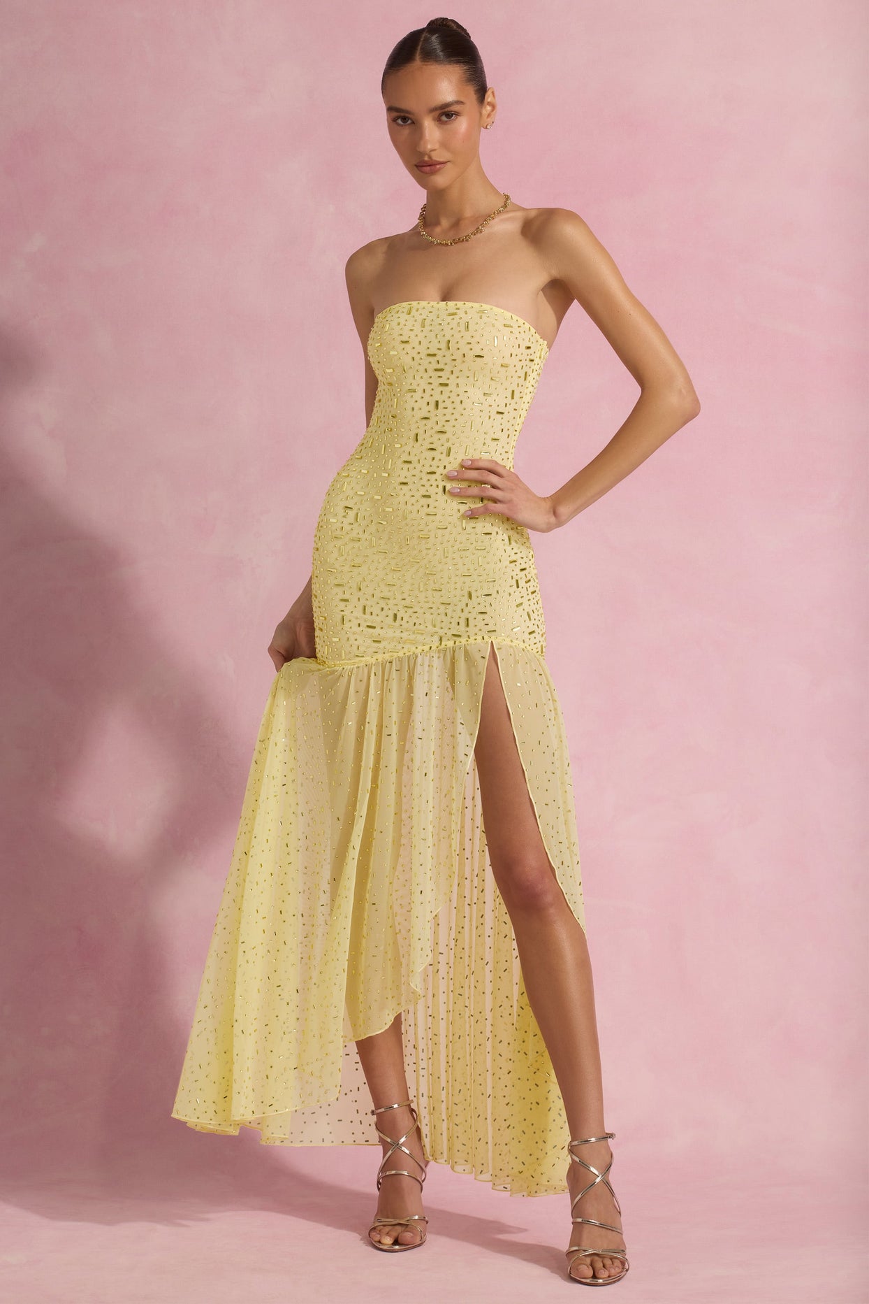 Semi-Sheer Embellished Asymmetric Maxi Dress in Yellow