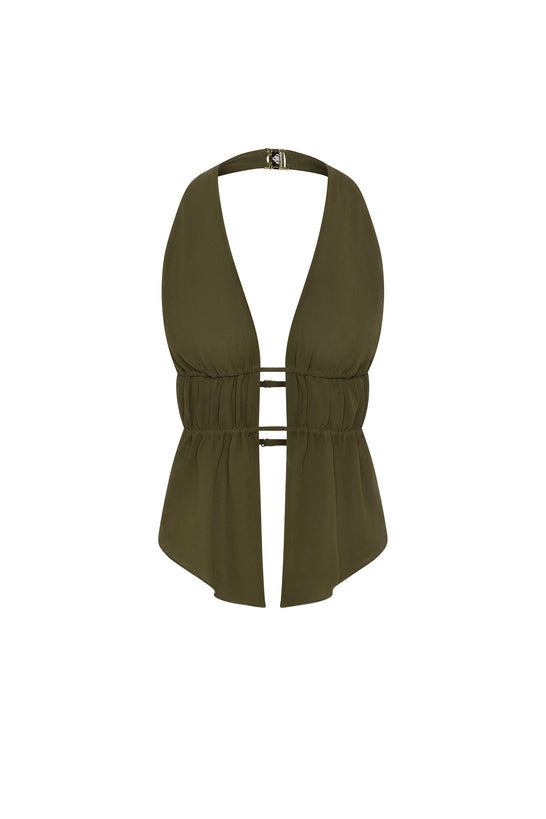 • Cut-Out Semi-Sheer Ruched Halterneck Crop Top in Dark Khaki
