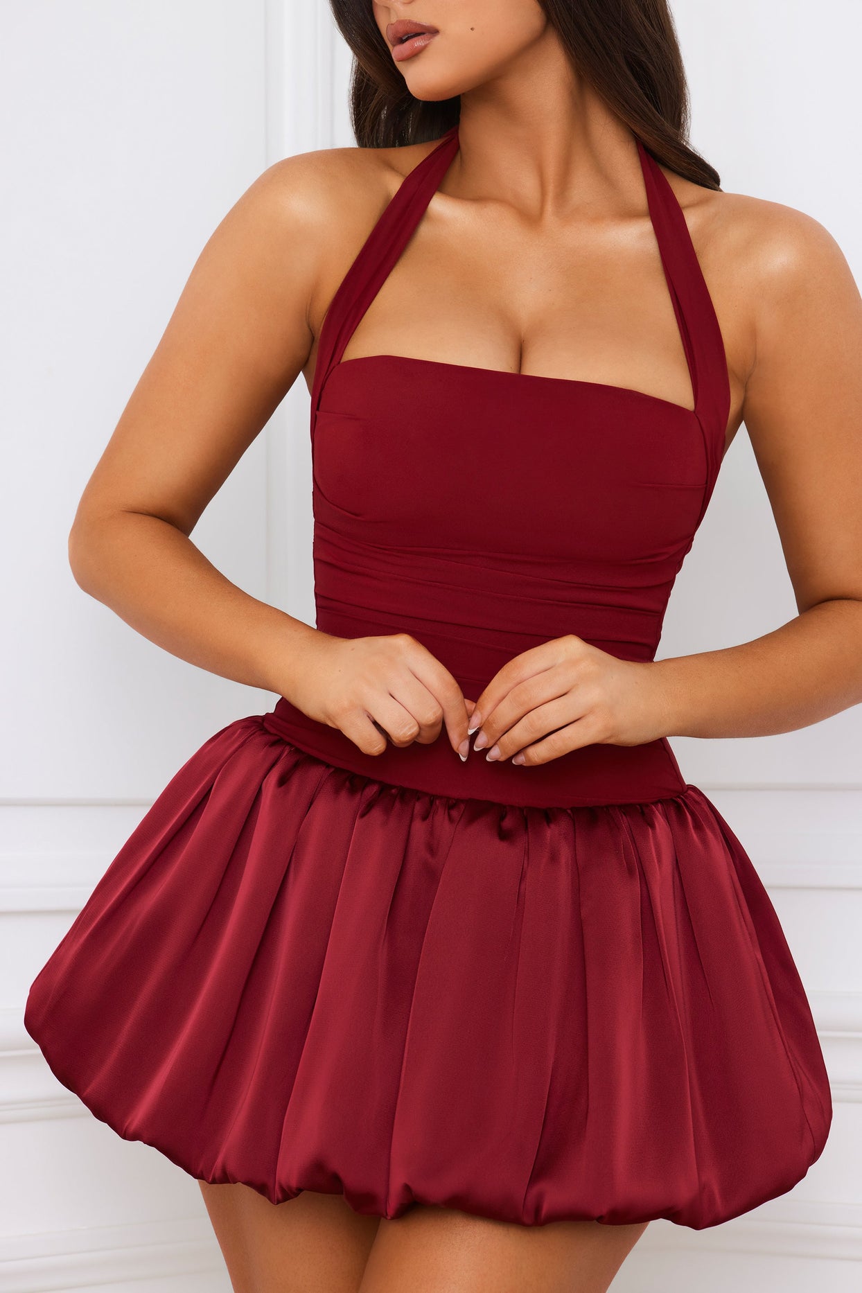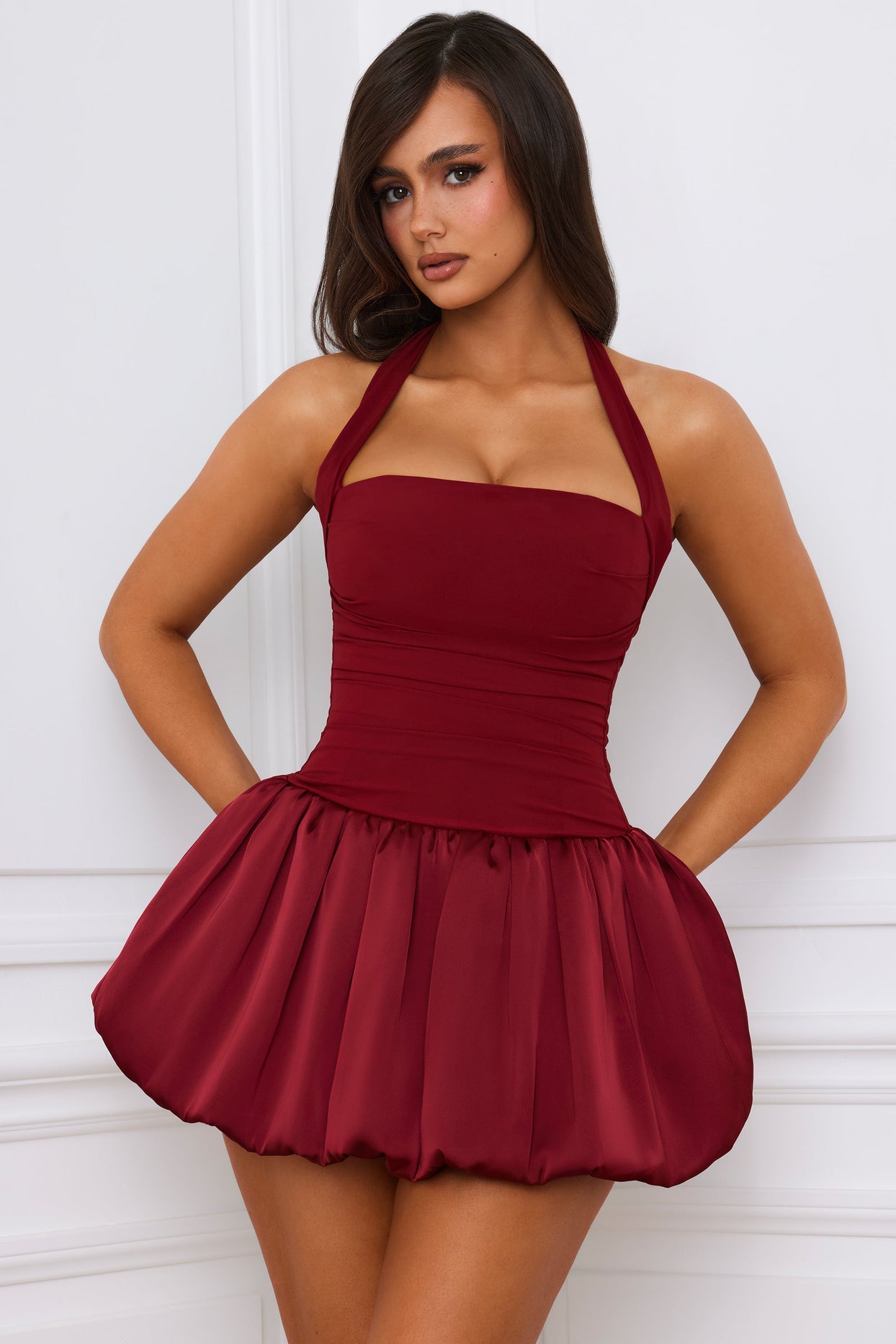 • Halterneck Lace-Up Bubble Hem Corset Micro Mini Dress in Berry Red