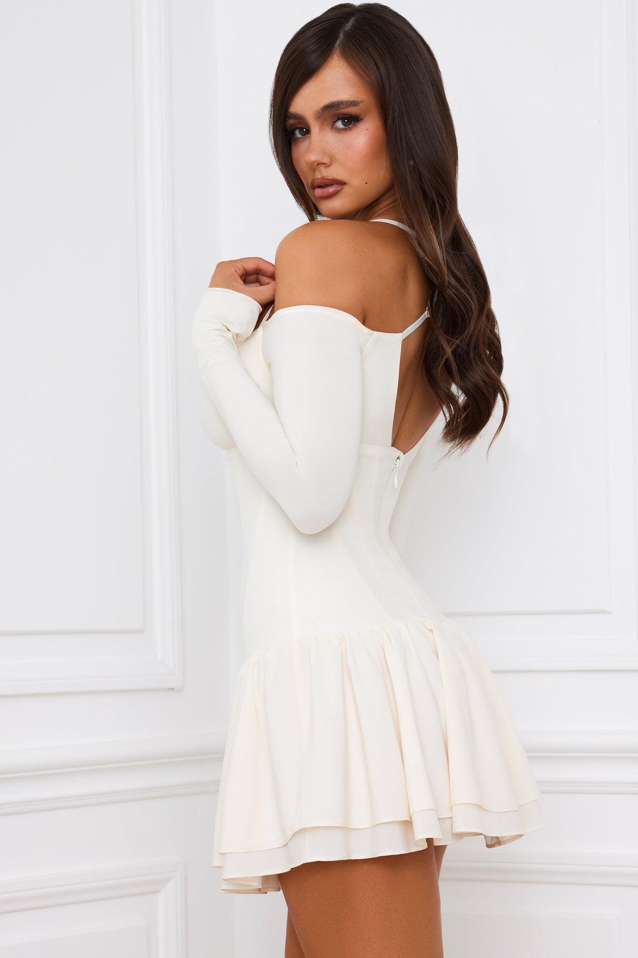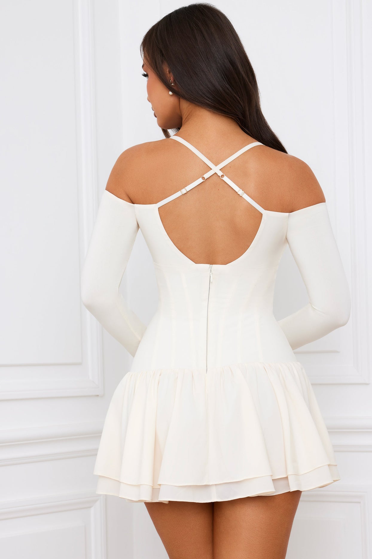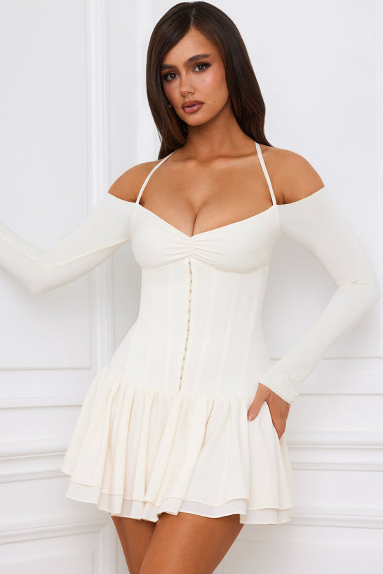 • Off-Shoulder Tiered Corset Mini Dress in Ivory